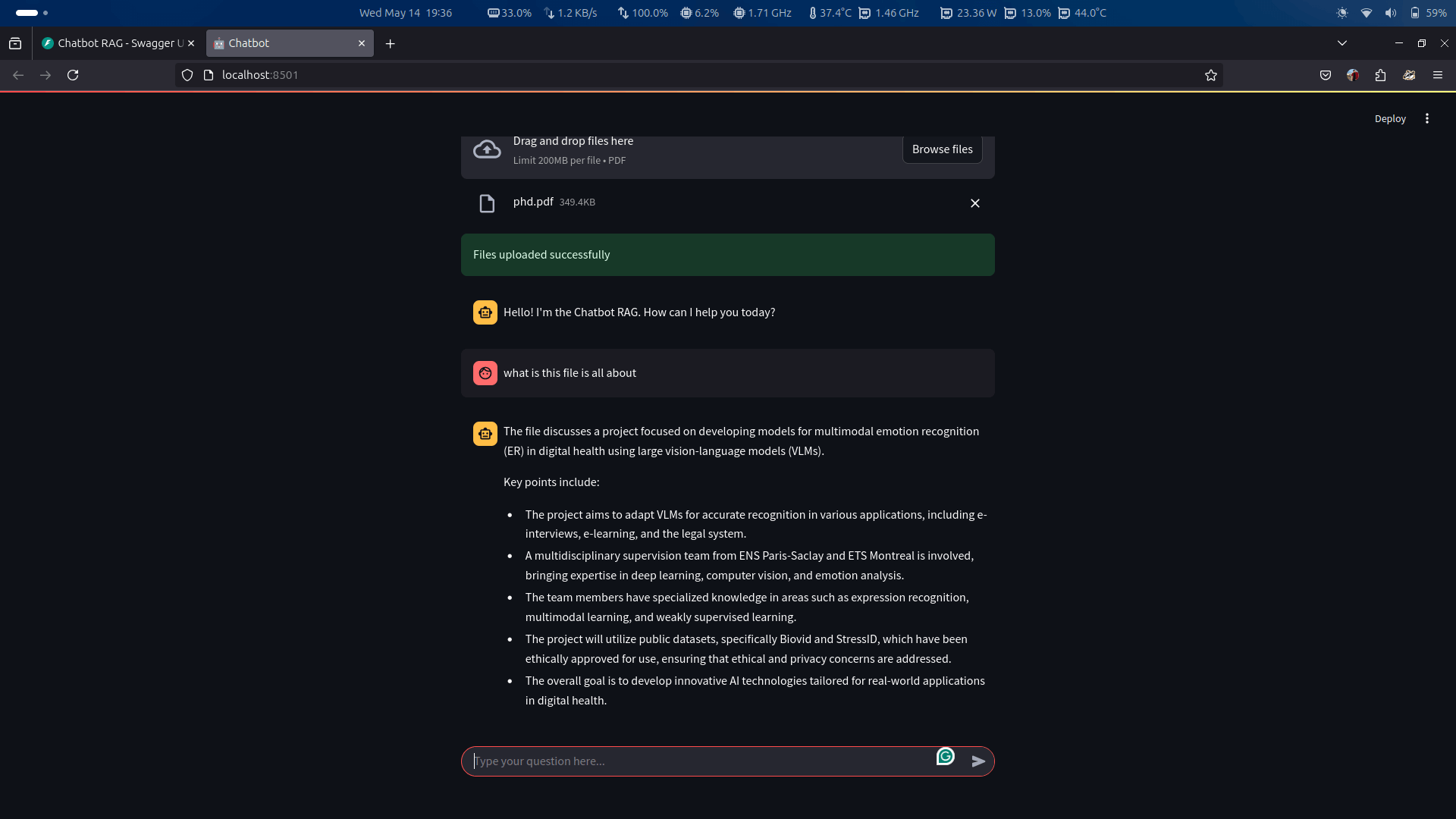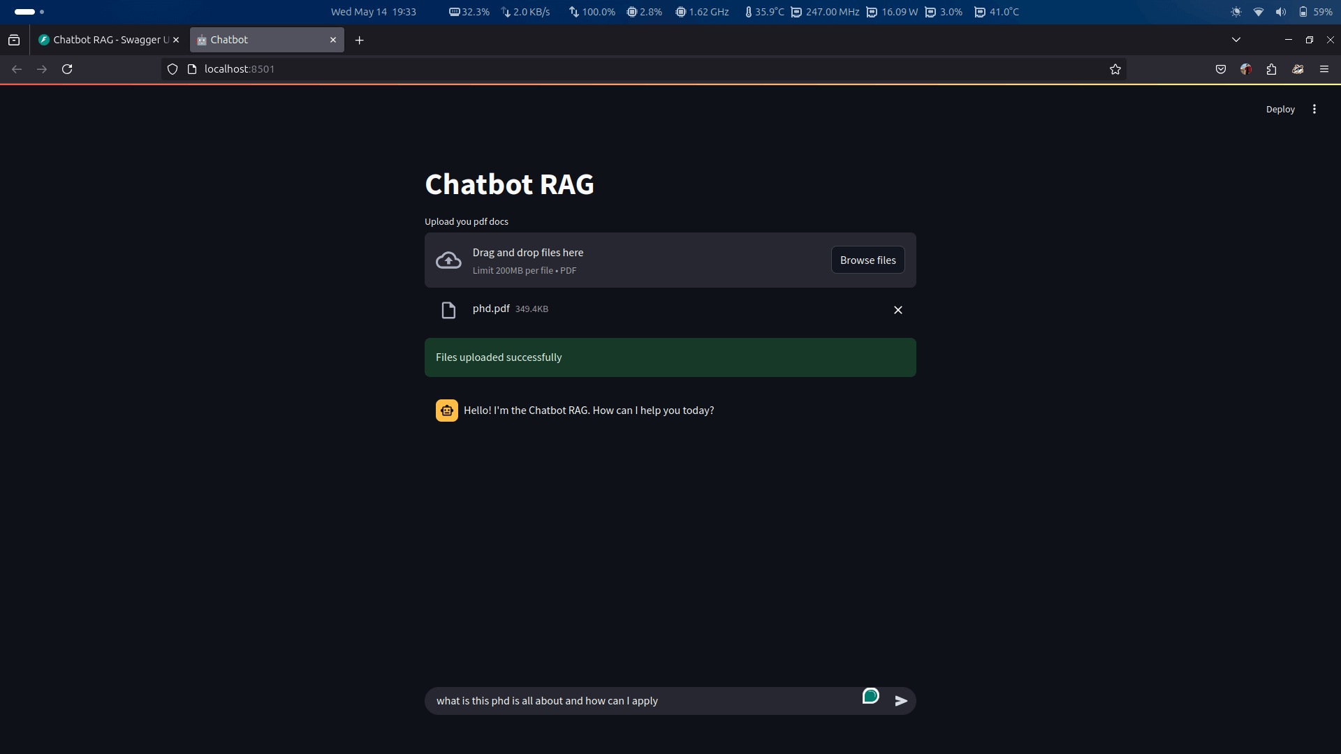 with st.chat_message(name="ai", avatar="ai"): st.write("Hello! I'm the Chatbot RAG. How can I help you today?") query = st.chat_input(placeholder="Type your question here...") if query: with st.chat_message("user"): st.write(query) answer = ask(query) with st.chat_message("ai"): st.write(answer) fastapi dev api.py #if you want to run for prodcution run fastapi run api.py streamlit run app.py http://127.0.0.1:8000http://localhost:8501 by defaultTo help you understand how to use the RAG chatbot, this section provides a step-by-step walkthrough with example screenshots from the chatbot-rag/images folder.