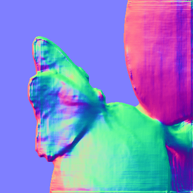 # do all the preprocessing to get the normal image image = depth_estimator(image_input)['predicted_depth'][0] image = image.numpy() image_depth = image.copy() image_depth -= np.min(image_depth) image_depth /= np.max(image_depth) bg_threhold = 0.4 x = cv2.Sobel(image, cv2.CV_32F, 1, 0, ksize=3) x[image_depth < bg_threhold] = 0 y = cv2.Sobel(image, cv2.CV_32F, 0, 1, ksize=3) y[image_depth < bg_threhold] = 0 z = np.ones_like(x) * np.pi * 2.0 image = np.stack([x, y, z], axis=2) image /= np.sum(image ** 2.0, axis=2, keepdims=True) ** 0.5 image = (image * 127.5 + 127.5).clip(0, 255).astype(np.uint8) image_normal = Image.fromarray(image) image_normal