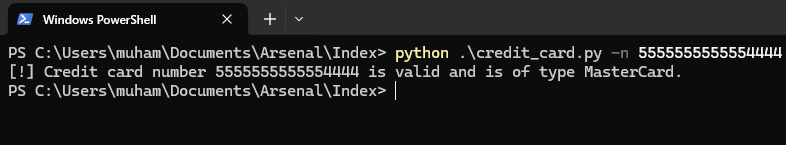 [!] Credit card number 4111111111111111 is valid and is of type Visa. [!] Credit card number 5555555555554444 is valid and is of type MasterCard. [!] Credit card number 378282246310005 is valid and is of type American Express. Screenshot: