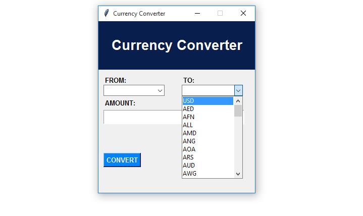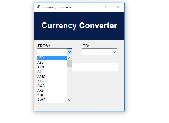 from_currency_combo = ttk.Combobox(bottom_frame, values=list(currencies.keys()), width=14, font=('Poppins 10 bold')) As you can notice, we have added the values argument to the combo box, and it is taking all the keys of the currencies dictionary in the form of a list.