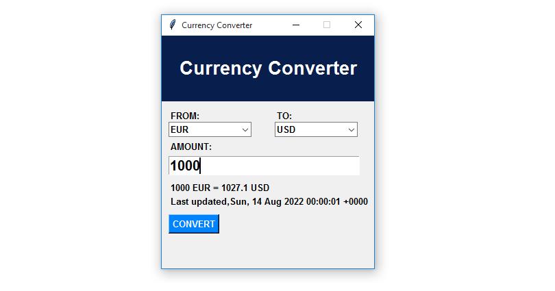 convert_button = Button(bottom_frame, text="CONVERT", bg=secondary, fg=white, font=('Poppins 10 bold'), command=Convert_Currency) Now the button knows what function to trigger after it is clicked, let us test this, run the program and fill the combo boxes with data (from EUR to USD) and enter an amount of 1000, click the button, and make sure you get the below output: