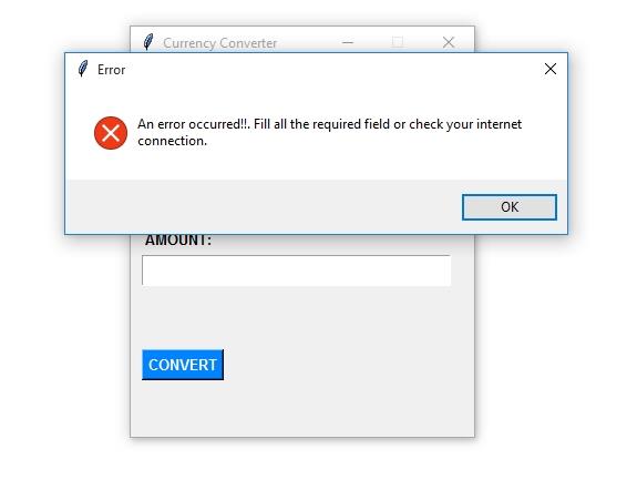 def convert_currency(): # will execute the code when everything is ok try: # getting currency from first combobox source = from_currency_combo.get() # getting currency from second combobox destination = to_currency_combo.get() # getting amound from amount_entry amount = amount_entry.get() # sending a request to the Pair Conversion url and converting it to json result = requests.get(f'https://v6.exchangerate-api.com/v6/{API_KEY}/pair/{source}/{destination}/{amount}').json() # getting the conversion result from response result converted_result = result['conversion_result'] # formatting the results formatted_result = f'{amount} {source} = {converted_result} {destination}' # adding text to the empty result label result_label.config(text=formatted_result) # adding text to the empty time label time_label.config(text='Last updated,' + result['time_last_update_utc']) # will catch all the errors that might occur # ConnectionTimeOut, JSONDecodeError etc except: showerror(title='Error', message='An error occurred!!') Rerun the application, but this time around, do not fill the required fields and click the Convert button. We will get this output: