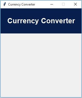 # importing everything from tkinter from tkinter import * # importing ttk widgets from tkinter from tkinter import ttk # creating the main window window = Tk() # this gives the window the width(310), height(320) and the position(center) window.geometry('310x340+500+200') # this is the title for the window window.title('Currency Converter') # this will make the window not resizable, since height and width is FALSE window.resizable(height=FALSE, width=FALSE) # this runs the window infinitely until it is closed window.mainloop() In the above code, we are creating the main window using the Tk() function that comes with Tkinter. We then define the dimensions of the window with the geometry() function. To give the window a title, we are using the title() function.
