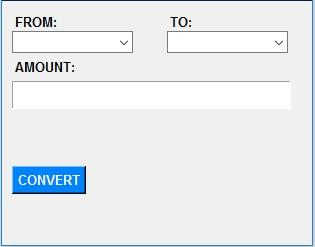 # the top frame top_frame = Frame(window, bg=primary, width=300, height=80) top_frame.grid(row=0, column=0) # label for the text Currency Converter name_label = Label(top_frame, text='Currency Converter', bg=primary, fg=white, pady=30, padx=24, justify=CENTER, font=('Poppins 20 bold')) name_label.grid(row=0, column=0) # the bottom frame bottom_frame = Frame(window, width=300, height=250) bottom_frame.grid(row=1, column=0) # widgets inside the bottom frame from_currency_label = Label(bottom_frame, text='FROM:', font=('Poppins 10 bold'), justify=LEFT) from_currency_label.place(x=5, y=10) to_currency_label = Label(bottom_frame, text='TO:', font=('Poppins 10 bold'), justify=RIGHT) to_currency_label.place(x=160, y=10) # this is the combobox for holding from_currencies from_currency_combo = ttk.Combobox(bottom_frame, width=14, font=('Poppins 10 bold')) from_currency_combo.place(x=5, y=30) # this is the combobox for holding to_currencies to_currency_combo = ttk.Combobox(bottom_frame, width=14, font=('Poppins 10 bold')) to_currency_combo.place(x=160, y=30) # the label for AMOUNT amount_label = Label(bottom_frame, text='AMOUNT:', font=('Poppins 10 bold')) amount_label.place(x=5, y=55) # entry for amount amount_entry = Entry(bottom_frame, width=25, font=('Poppins 15 bold')) amount_entry.place(x=5, y=80) # an empty label for displaying the result result_label = Label(bottom_frame, text='', font=('Poppins 10 bold')) result_label.place(x=5, y=115) # an empty label for displaying the time time_label = Label(bottom_frame, text='', font=('Poppins 10 bold')) time_label.place(x=5, y=135) # the clickable button for converting the currency convert_button = Button(bottom_frame, text="CONVERT", bg=secondary, fg=white, font=('Poppins 10 bold')) convert_button.place(x=5, y=165) We are creating a bottom frame; just like the top frame, we will place the bottom frame inside the main window. Inside this frame, we will place the remaining widgets, the two labels, the two combo boxes, the entry, and the button.