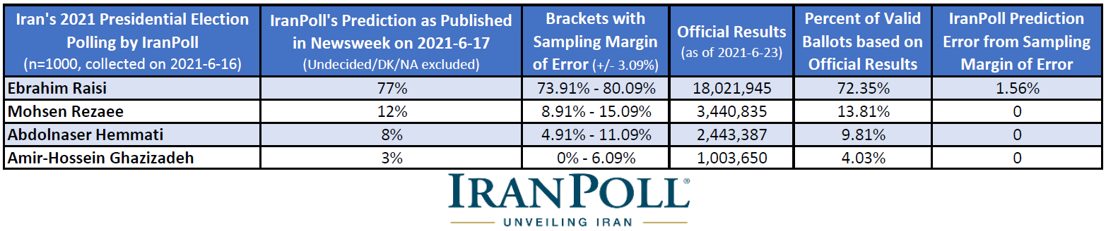 IranPoll predicted the voting results for 3 out of 4 candidates accurately within the specified margin of sampling error and our prediction was only 1.56% outside of the margin of sampling error for the fourth candidate.