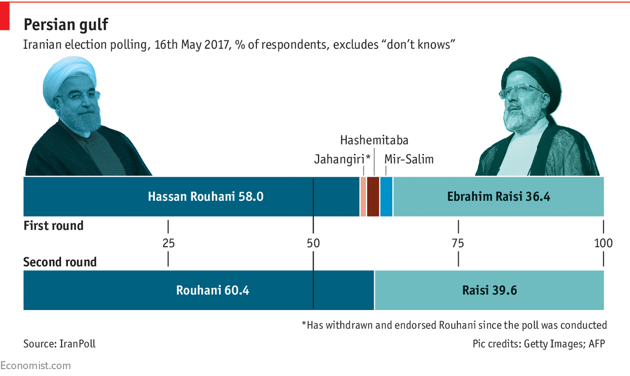 The following graph was published by The Economist on May 19th 2017 using IranPoll’s data from May 16th 2017: