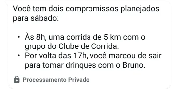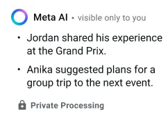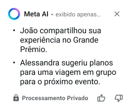 Quando as mensagens não lidas ficam acumuladas, a Meta AI pode ajudar com um resumo. Assim, você fica por dentro do assunto e pode voltar para a conversa. A tecnologia de Processamento Privado permite que a Meta AI processe suas mensagens sem que a Meta nem o WhatsApp possam ler a conversa.
