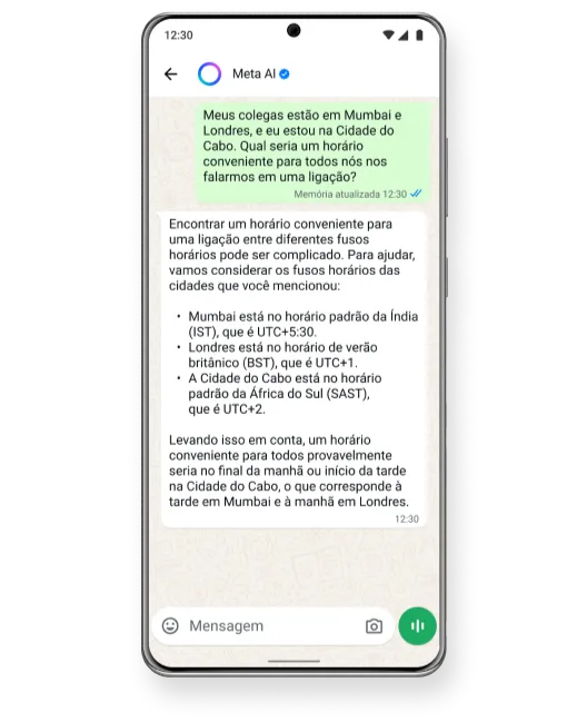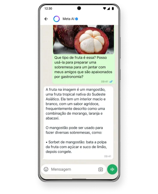 Receba ajuda da Meta AI para o que você quiser, por texto ou por voz. Seja para resolver um problema de matemática, editar uma foto ou encontrar um restaurante que todos do grupo gostem.