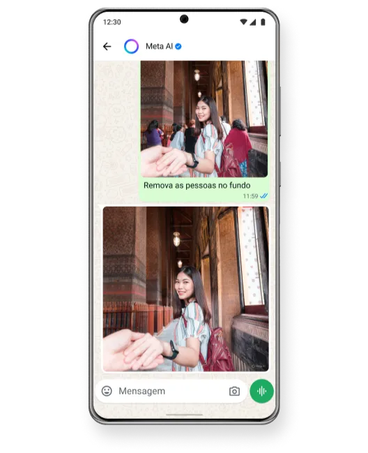 Dê vida às suas ideias usando a Meta AI para editar suas fotos ou criar novas imagens geradas por IA: seja para usar como imagem do grupo, definir como plano de fundo da ligação de vídeo ou enviar em uma conversa.
